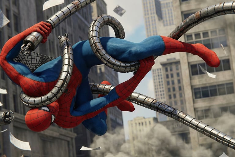 O Homem-Aranha reagiu no milésimo de segundo. Segurou toneladas de destroços sobre os ombros, cravando os pés no asfalto como se tentasse ancorar o próprio mundo. Os bombeiros levaram instantes eternos para chegar. Quando finalmente estabilizaram o que restava da estrutura, os tentáculos já haviam fugido. Octavius liberto — e faminto por caos