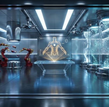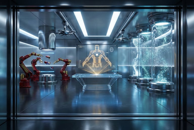 O laboratório de Tony Stark não parece ter sido construído — parece cultivado. Hologramas, braços robóticos em sincronia perfeita, partículas de luz dançando no ar, a estrutura metálica e limpa refletindo uma paleta de azuis, dourados e vermelhos. Bancadas flutuantes, impressoras de nanotecnologia pulsando como corações artificiais, e uma sensação irresistível de que, ali, a ciência está sempre alguns passos à frente do resto do planeta.